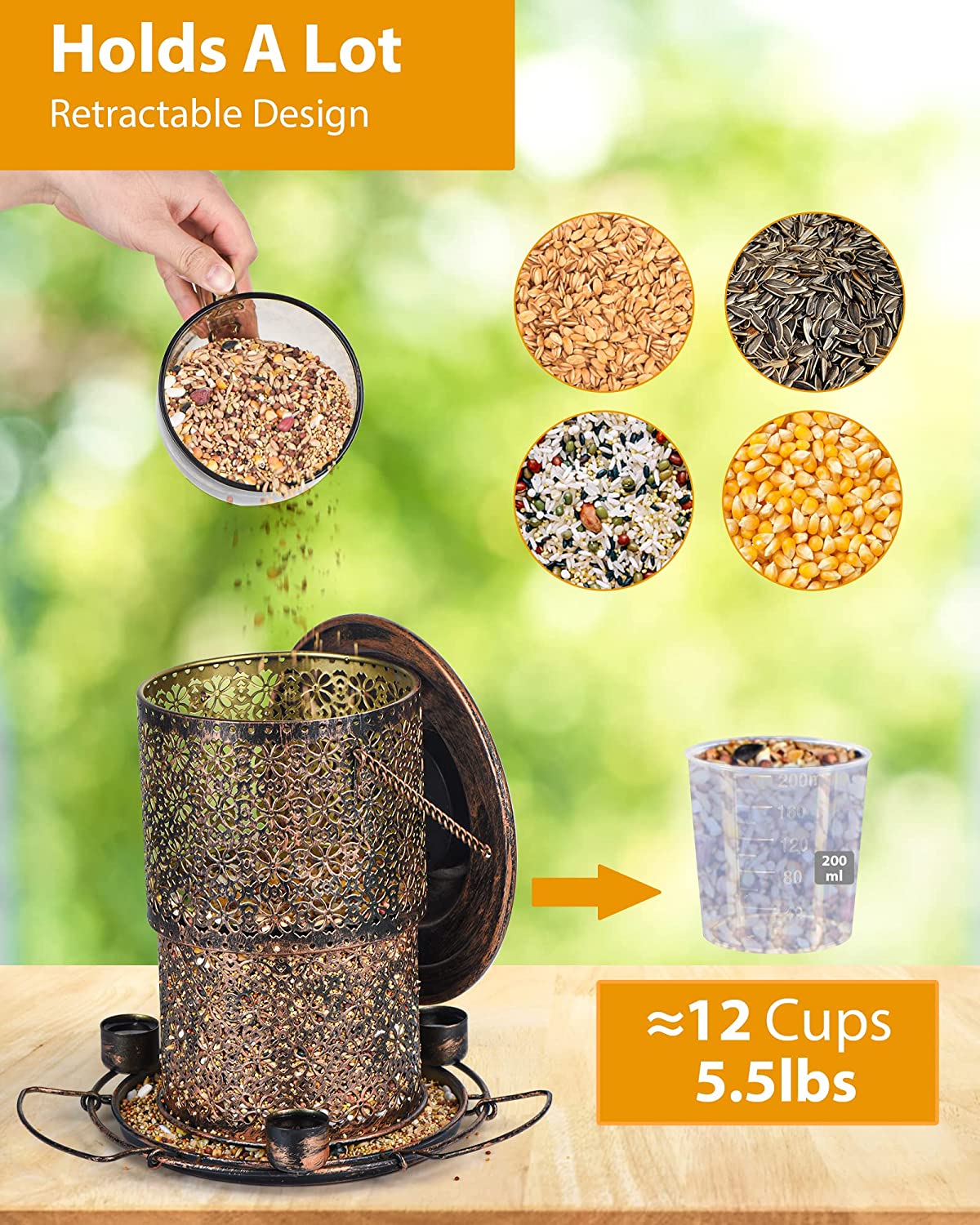 - 🦜[Unique Design-360° Feeding]Our retractable wild bird feeder is made by two part cylinder that nest into each other. Made of heavy-duty metal which is sturdy and durable to resist all kinds of weather and squirrel proof. 360° panoramic gazebo bird feeder, wider roof shields the birds from sun and rain. The strong bars and water cup is suitable for multiple clinging birds can dine at one time.